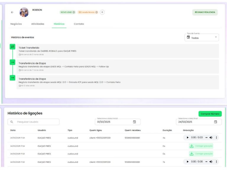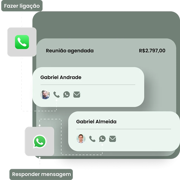 Ligações na nuvem 1x1 que ficam gravadas, atividades de WhatsApp, agendamentos e e-mails em um único lugar e com poucos cliques.