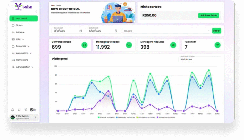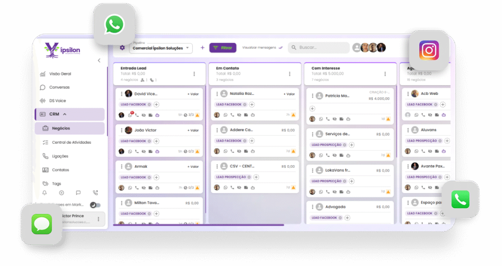Com a Ípsilon, você consegue fazer ligações para seus leads com um clique, consegue abrir o Whatsapp com um popup sem sair do crm, organize pipelines com cadência de tarefas e gerenciamento de atividades.